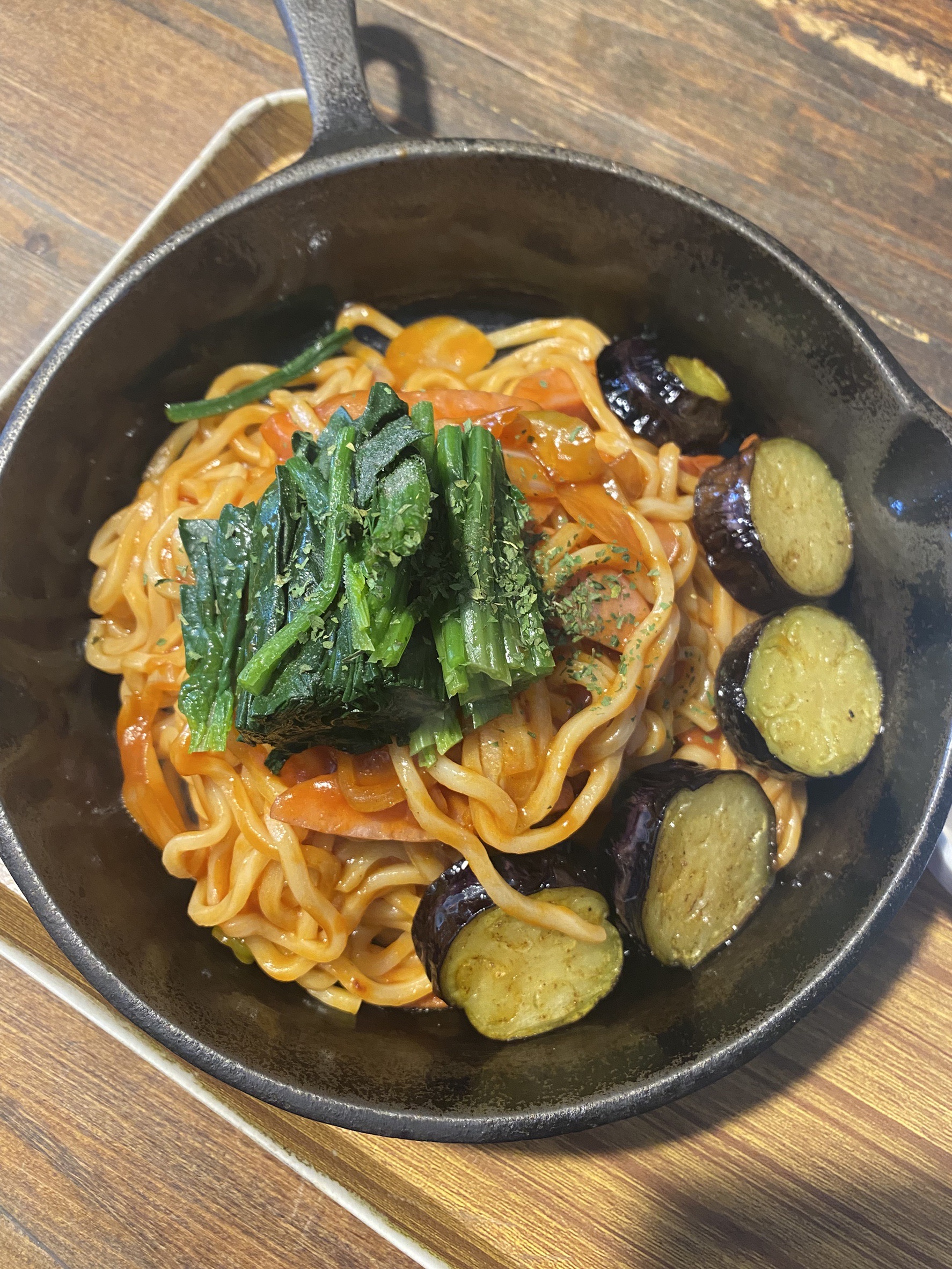 仲間のメニューは、ナスの旨みと、もちっとした麺。