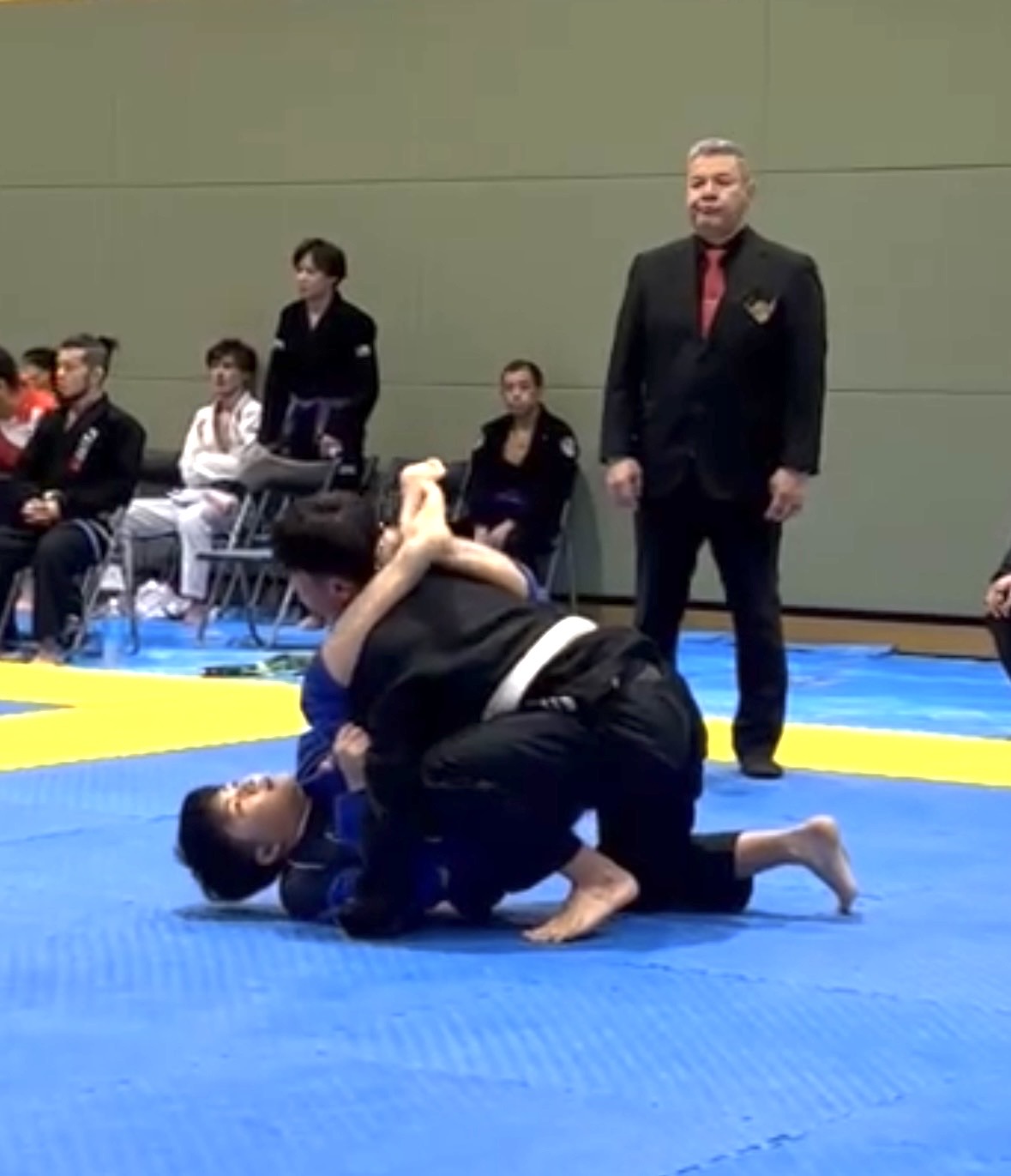 相手の頭を下げて三角絞めの形を作ったが、上手くプレッシャーを掛けきれず、外れる。